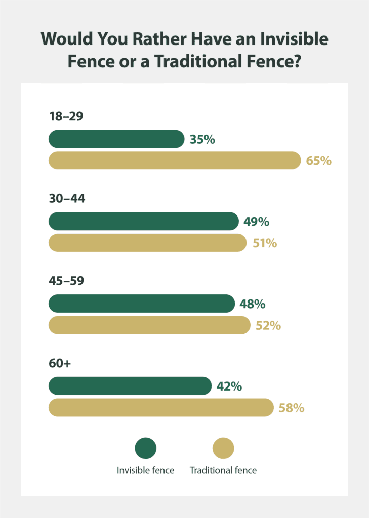 Interestingly, our youngest respondents (ages 18-29) and our most senior participants (60+) both expressed a strong preference for traditional fences. 65% of our 18-29 respondents said they would install an invisible fence — which isn’t too far from the 58% of 60+ respondents who felt the same way.