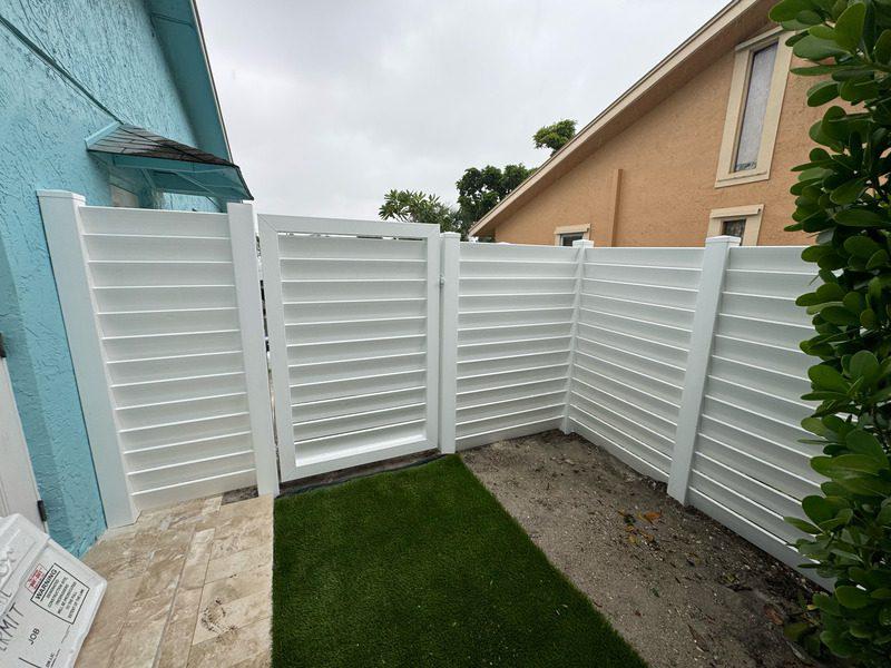 Known for its striking and modern angled slat design, louvered fences allow light and airflow in while still providing a sense of privacy. These fences are perfect for creating shaded outdoor spaces with a contemporary feel