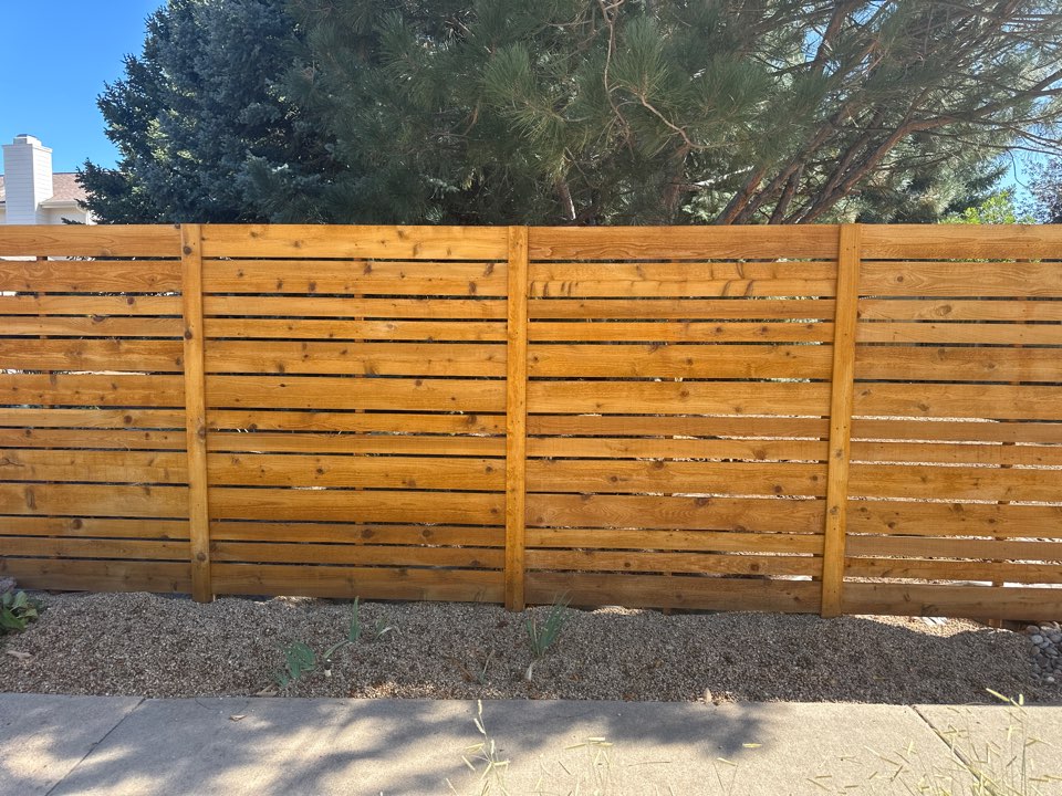 A beautiful new horizontal wood fence stepped and stained. Loveland, Colorado.