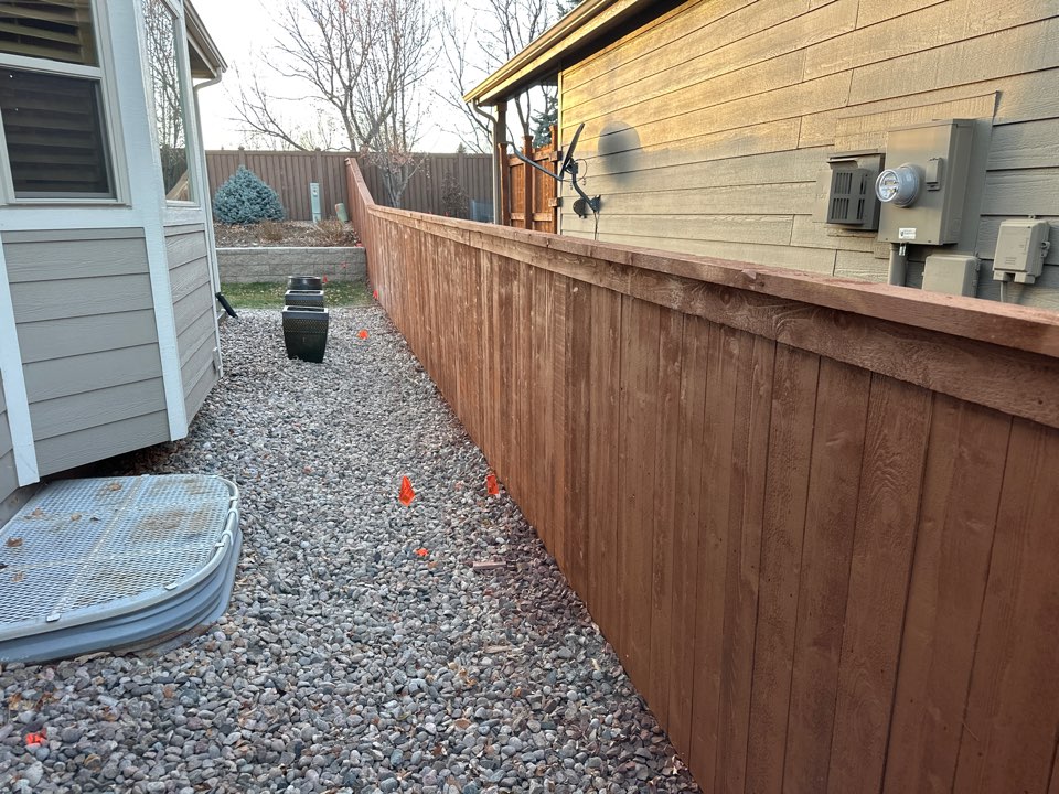 6 foot tall privacy fence with cap and trim. Stained to the HOA specifications for a new homeowner in Johnstown Colorado